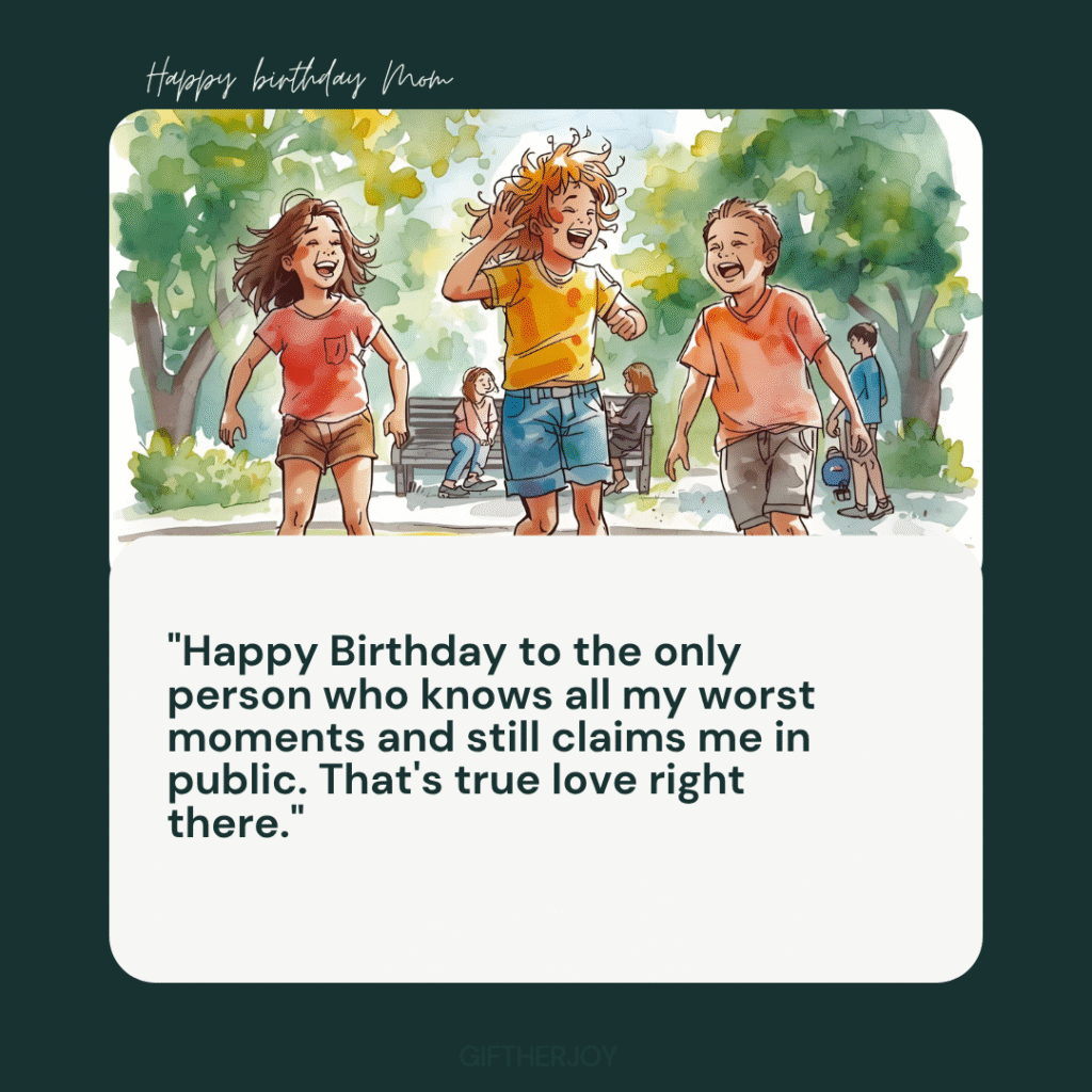 The sweet spot for funny mom birthday wishes is poking fun at the relationship you have together, not just making generic old jokes. Trust me on this. Something like “Happy Birthday, Mom! Thanks for not selling me to the circus when I was a teenager – I know it was tempting” hits different than just another “you’re getting old” message. It acknowledges your actual history together, and that’s what makes it genuinely funny instead of just… awkward.